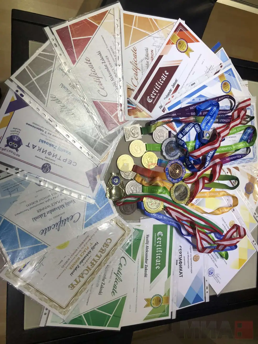 -За математика има дарба тоа е несомнено. Учителката уште во второ одделение рече дека се истакнува во класот, дека решава задачи и за поголеми деца без некој посебен труд. Сега поради тенисот и жртвувањето за тренинзите тој не ни има време многу да се посвети на вежбање математика. Со малку труд решава многу задачи, а има секој година голем број на награди, први места, медали и слично. Да посвети уште повеќе време на математиката уште поголеми успеси би имал. Но сепак повеќе е концентриран на тенисот, објаснува Марија.