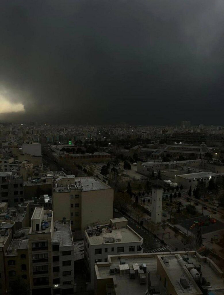 Видеата споделени од граѓански новинари покажаа огромни пламени над небото на Техеран преку ноќ и чад што сè уште се извишува над објектите за складирање нафта. Додека дождот паѓаше врз градот со 10 милиони луѓе во недела наутро, властите предупредија на токсичен кисел дожд и многу жители се разбудија со болки во грлото и печење во очите.