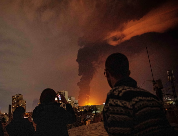 Видеата споделени од граѓански новинари покажаа огромни пламени над небото на Техеран преку ноќ и чад што сè уште се извишува над објектите за складирање нафта. Додека дождот паѓаше врз градот со 10 милиони луѓе во недела наутро, властите предупредија на токсичен кисел дожд и многу жители се разбудија со болки во грлото и печење во очите.