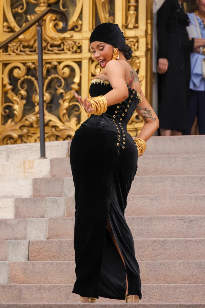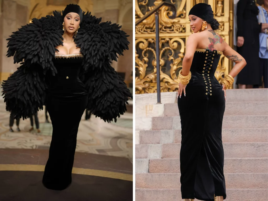 Карди Б приреди шоу на скалите на настанот во преголемо црно болеро покриено со текстура на раб како пердув. Болерото му даде на ансамблот на Карди Б готски ефект на „Големата птица“ .