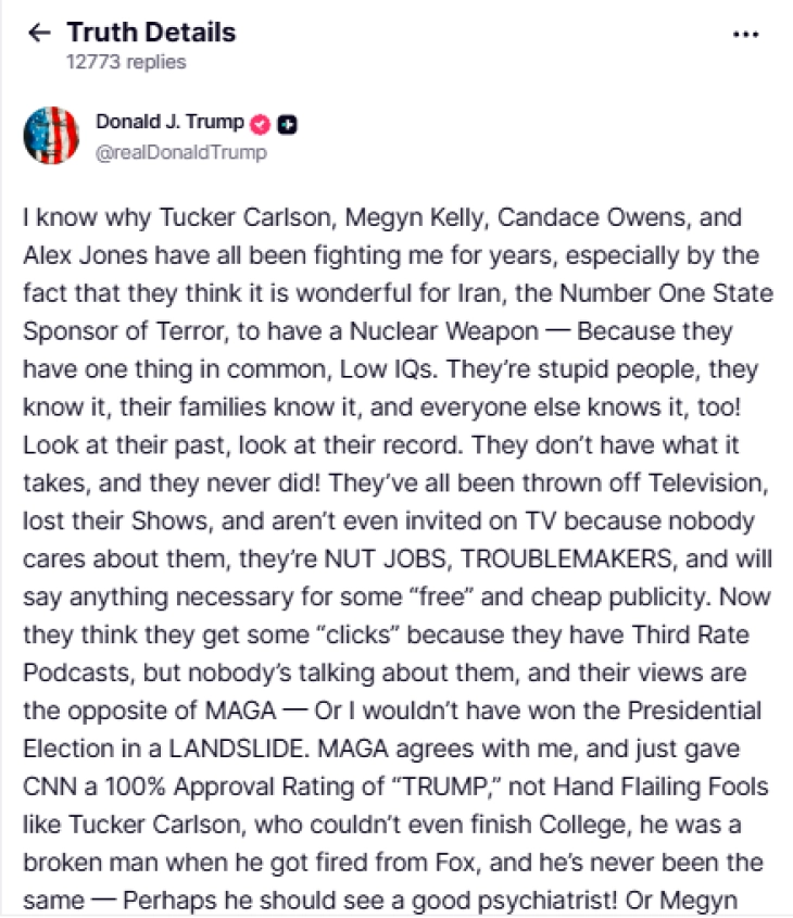 „Знам зошто Такер Карлсон, Мегин Кели, Кандис Овенс и Алекс Џонс мислат дека е одлично што Иран, водечкиот државен спонзор на тероризмот во светот, има нуклеарно оружје“, напиша републиканскиот милијардер на својата мрежа Truth Social.
