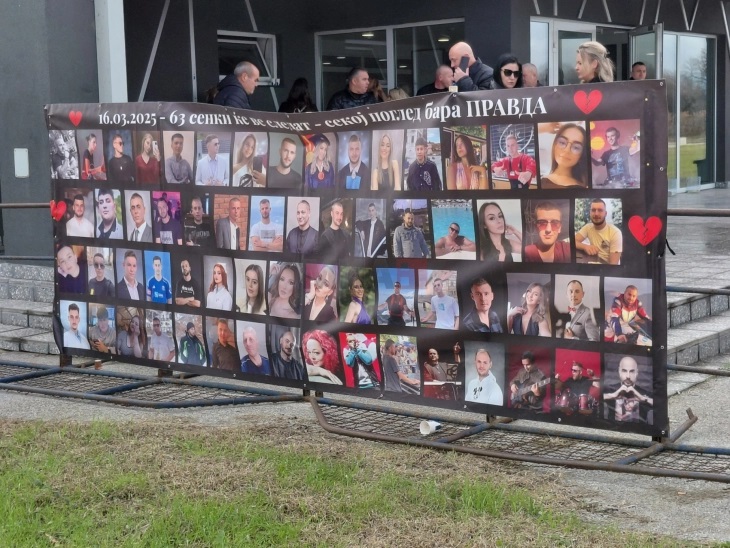Транспарент со фотографии од загинатите во „Пулс“ ги пречека денеска обвинетите на рочиштето