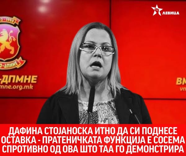 „Бараме итна оставка од пратеничката од редовите на ДПМНЕ, Дафина Стојаноска од гостиварско, која очигледно и веќе во неколку наврати не ја разбира функцијата која ја обавува и мандатот кој ѝ е доверен од граѓаните. Објавувањето снимка во која се појавуваат малолетните деца на претседателот на Сојузот на синдикатите на Македонија претставува особено тежок морален и институционален пад за носител на јавна функција. Кога пратеник свесно користи материјал произлезен од следење на синдикален претставник и тоа го пласира во јавноста како средство за дискредитација, станува збор за злоупотреба на мандатот и грубо деградирање на парламентарната функција.