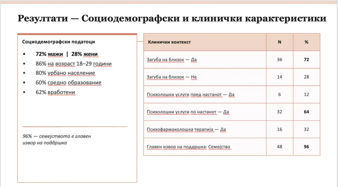 Дури 72 проценти од испитаниците пријавиле загуба на блиска личност во трагичниот настан, што се покажувало како значаен фактор за појава на ПТСР. Истовремено, 96 проценти го наведиле семејството како главен извор на поддршка, што ја нагласувало неговата клучна улога во процесот на опоравување.