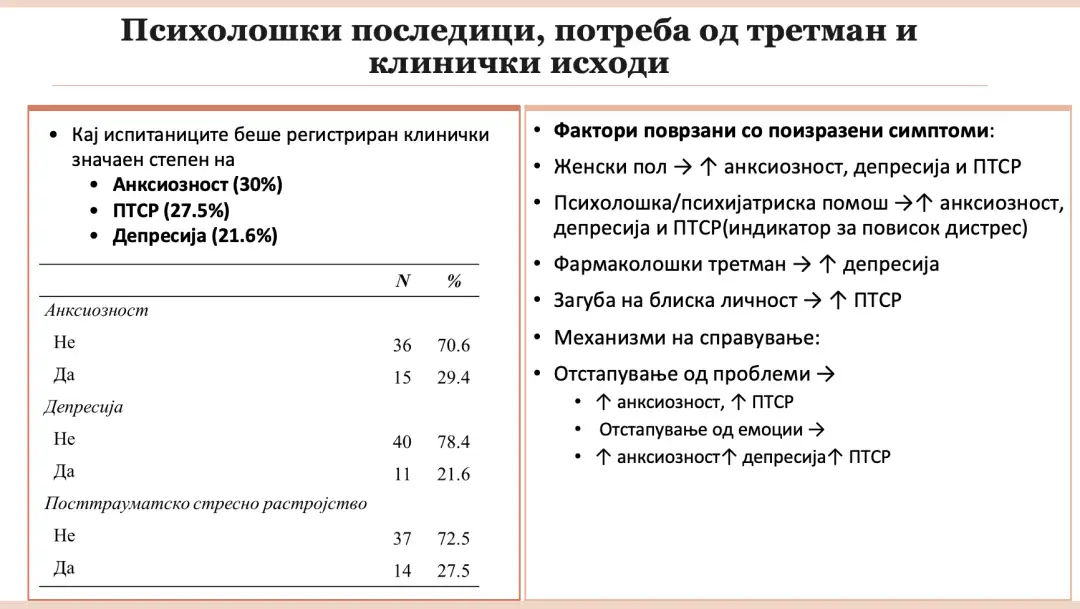 Преживеаните и повредени лица од пожари се соочуваат со сериозни психолошки последици – потенцира проф. д-р Славица Арсова, директорка на Универзитетската клиника за психијатрија, на втората научна конференција на Универзитетската клиника за дерматологија, што се одржа викендов во Скопје. Ова го покажа истражувањето на Универзитетската клиника за психијатрија спроведено кај 50 повредени лица во трагичниот пожар во Кочани – испитаници што биле лекувани во рамките на третманот на лузни со PDL (pulsed dye laser) на Универзитетската клиника за дерматологија. Резултатите покажуваат дека кај една третина од испитаниците е регистрирана анксиозност, 27,5 проценти имаат симптоми на посттрауматско стресно нарушување (ПТСР), а 21,6 процент се соочуваат со депресија – се наведува во денешното соопштение на Клиниката за психијатрија.