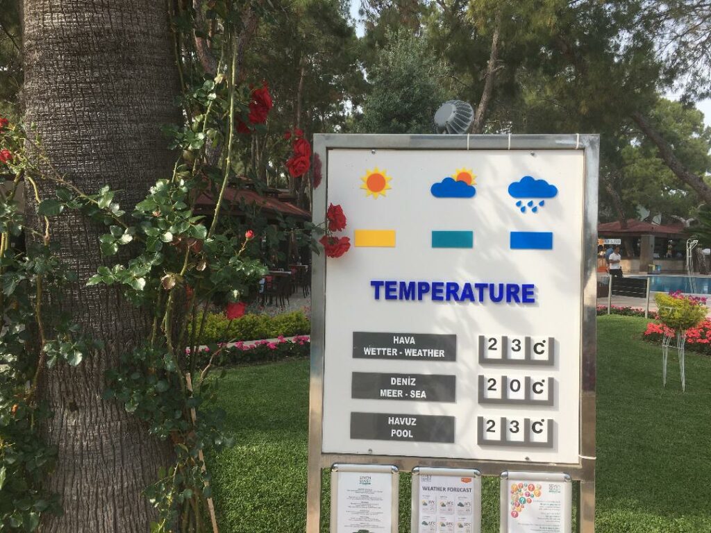 Токму, во мај, кога температурата се движи меѓу 24 до триесет степени, со 40 отсто влажност, наспроти топлотниот африкански бран кој знае да ја зафати Анталија во јули и во август па температурата може да достигне и до 50 степени, а има еден и ден во годината кога температурата на морето оди и до 42 степени. Затоа на плажите нема чадори туку тенди, а сите хотелски барови нудат дебели сенки во кои туристите уживаат со студен пијалок. Летната сезона започнува во април и трае до крајот на ноември.