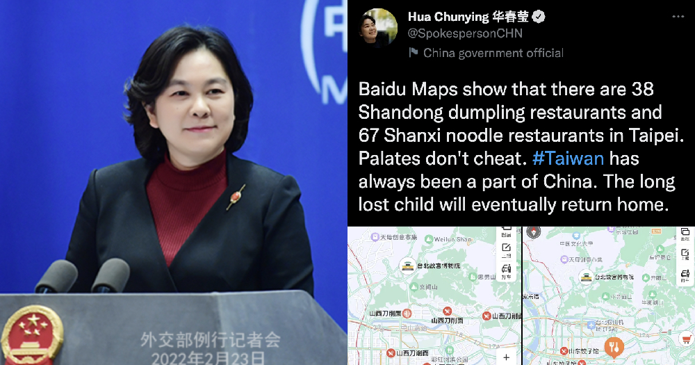 „Baidu Maps, една од главните апликации за мапи во Кина, покажува дека има 38 ресторани во Тајпеј кои нудат кујна од кинеската провинција Шандонг и 67 ресторани кои нудат специјалитети од провинцијата Шанкси“ – напиша Хуа Чунјинг вчера на Твитер.