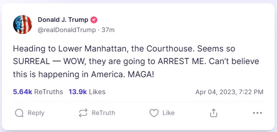 „Изгледа надреално. Леле, ЌЕ БИДАМ УАПСЕН. Не ми се верува дека ова се случува во Америка. МАГА!", напиша Трамп.