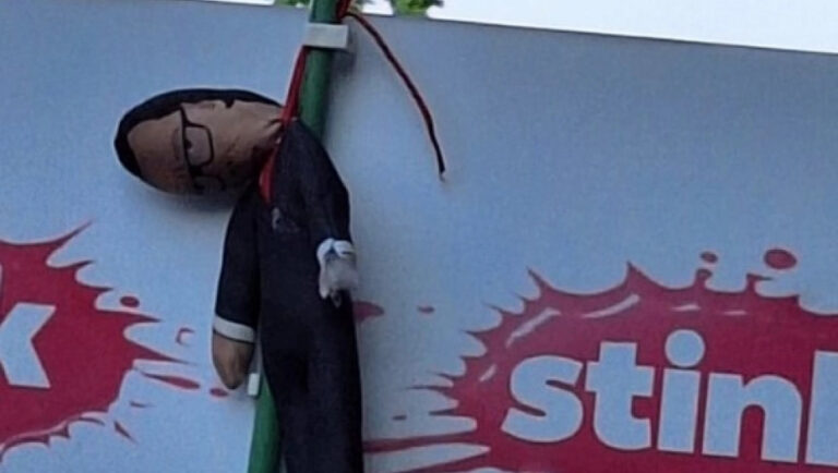Уапсен новинарот кој на протестот во Белград носеше кукла со „обесен Вучиќ“