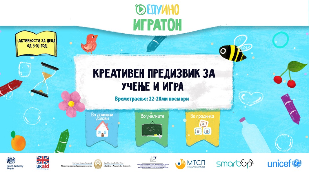По повод 20-ти ноември, Светскиот ден на детето, тимот од колективниот портал ЕДУИНО сака да поттикне безброј насмевки преку креативниот предизвик ЕДУИНО Игратон! Со почеток од 22 до 28 ноември, 2021 година, може да учествуваат сите деца од 3 до 10 годишна возраст во домашни услови со родителите/старателите, во градинките со воспитувачите и во училиштата со наставниците. Со вашето учество, целата држава ќе игра и учи!