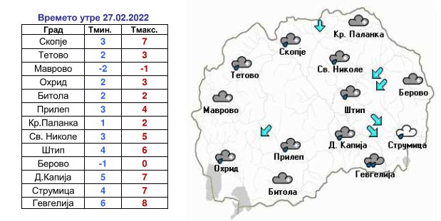 Од денес вечер, во текот на ноќта и утре времето ќе биде облачно со врнежи од дожд, а на планините и на повисоките места со врнежи од снег.