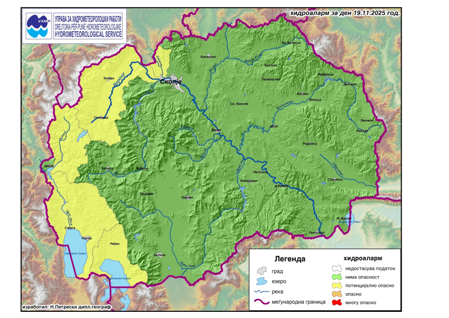 Управата за хидрометеоролошки работи (УХМР) објави хидролошко предупредување за утрешниот ден, 19 ноември 2025 година.