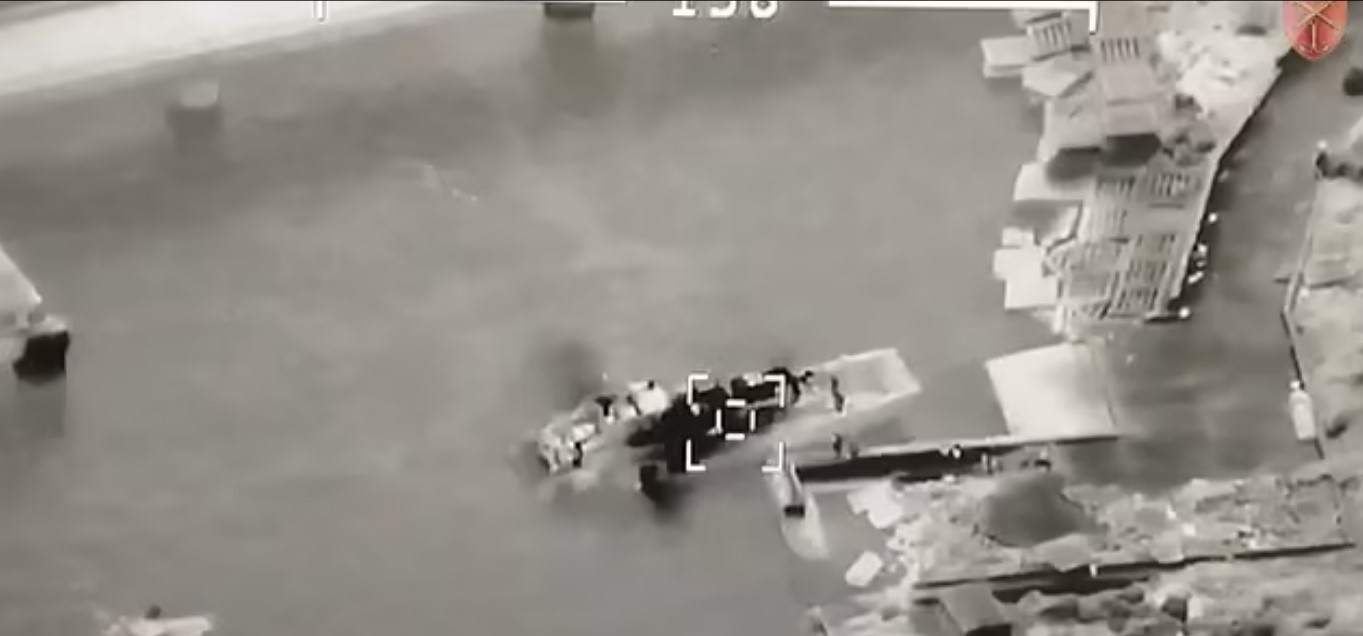 Украина денеска прикажа видео во кое се тврди дека со беспилотно летало е погоден руски десантен брод кој доставувал противвоздушен ракетен систем TOR на Змискиот остров.