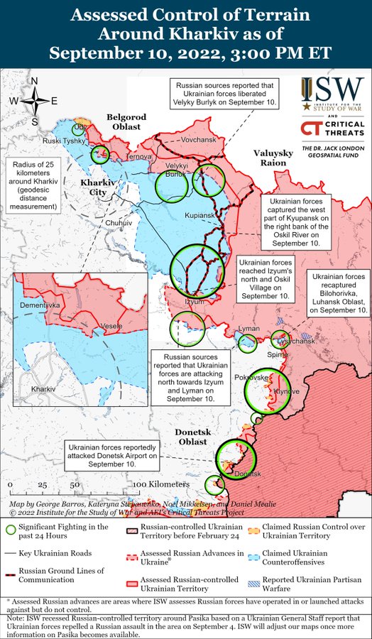 Британското Министерство за одбрана потврди дека во последните 24 часа, украинските сили продолжиле значително да напредуваат во регионот на Харкив. Русија се повлече од областа, но борбите продолжуваат во близина на стратешки важните градови Изјум и Купјанск кои веќе се под контрола на украинските сили.