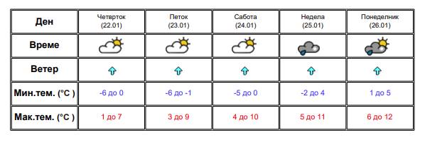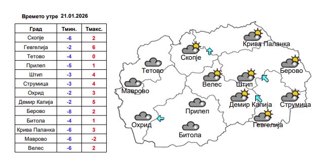 Времето утре ќе биде облачно со повремени локални врнежи од снег. Пообилни врнежи ќе има во западните делови и се очекува висината на снежната покривка на планините и на некои од повисоките места да се зголеми до 25 cm.
