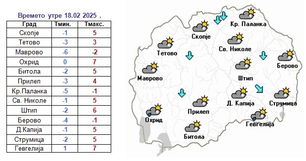 Според прогнозата на УХМР, времето утре ќе биде променливо облачно со повремени слаби врнежи од снег.