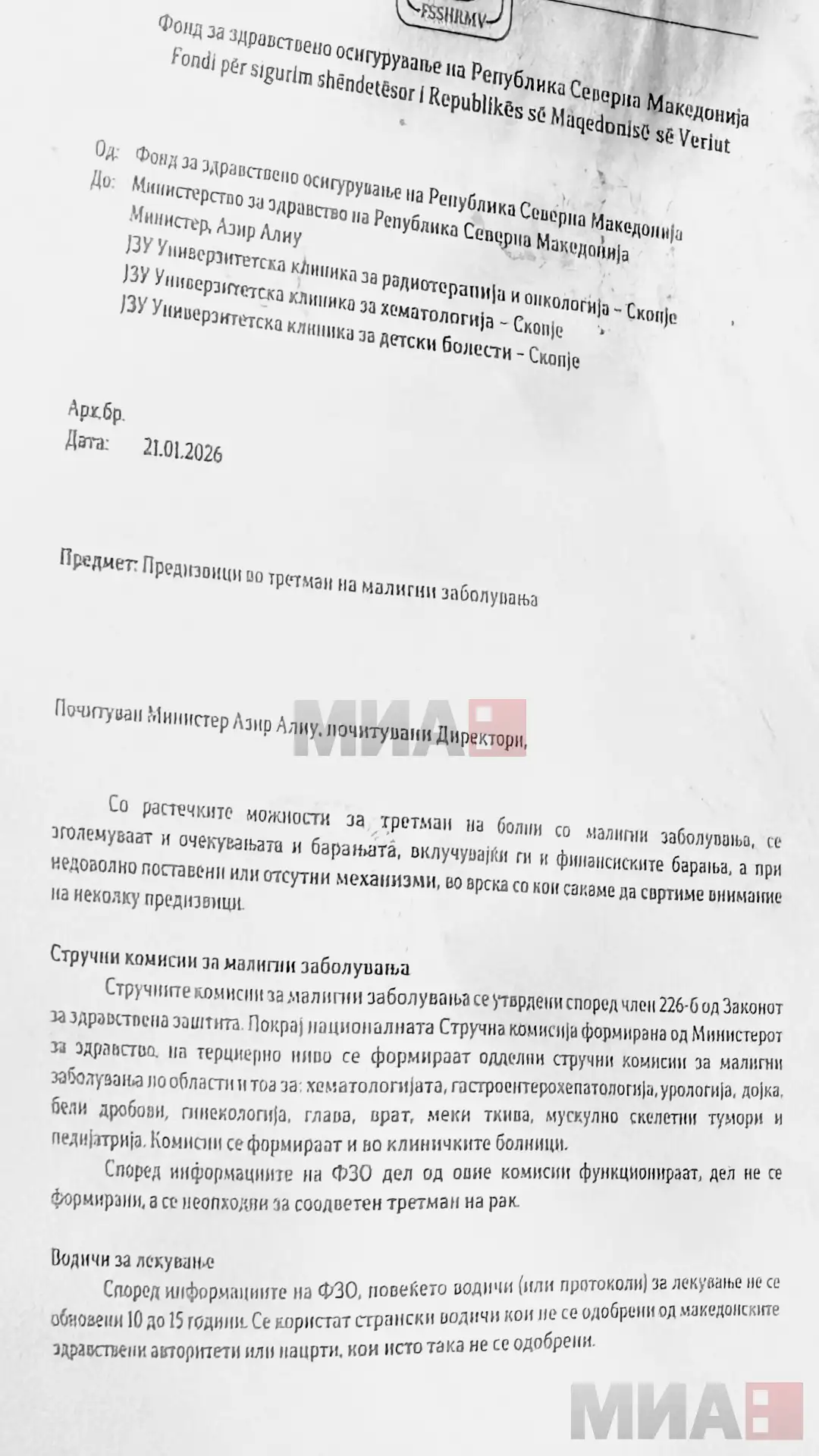 Тој се повика на допис од Фондот за здравствено осигурување (ФЗО) од 21 јануари 2026 година, во кој, според него, се констатира дека во земјава се користат странски водичи кои не се официјално одобрени, а националните протоколи се застарени.