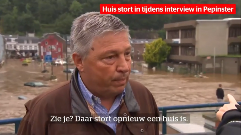 This is the moment an interview with the mayor of Pepinster in Belgium was interrupted by the sight of a flooded building collapsing and people escaping on the roof.