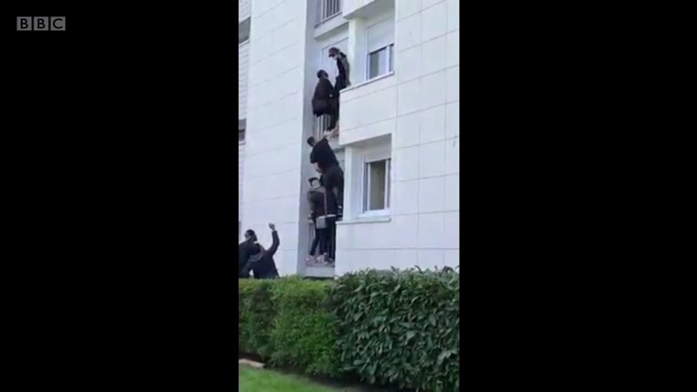 На драматичните снимки се гледа како младите им помагаат на членовите од семејството да побегнат од станот на трети кат во неделата попладне.
