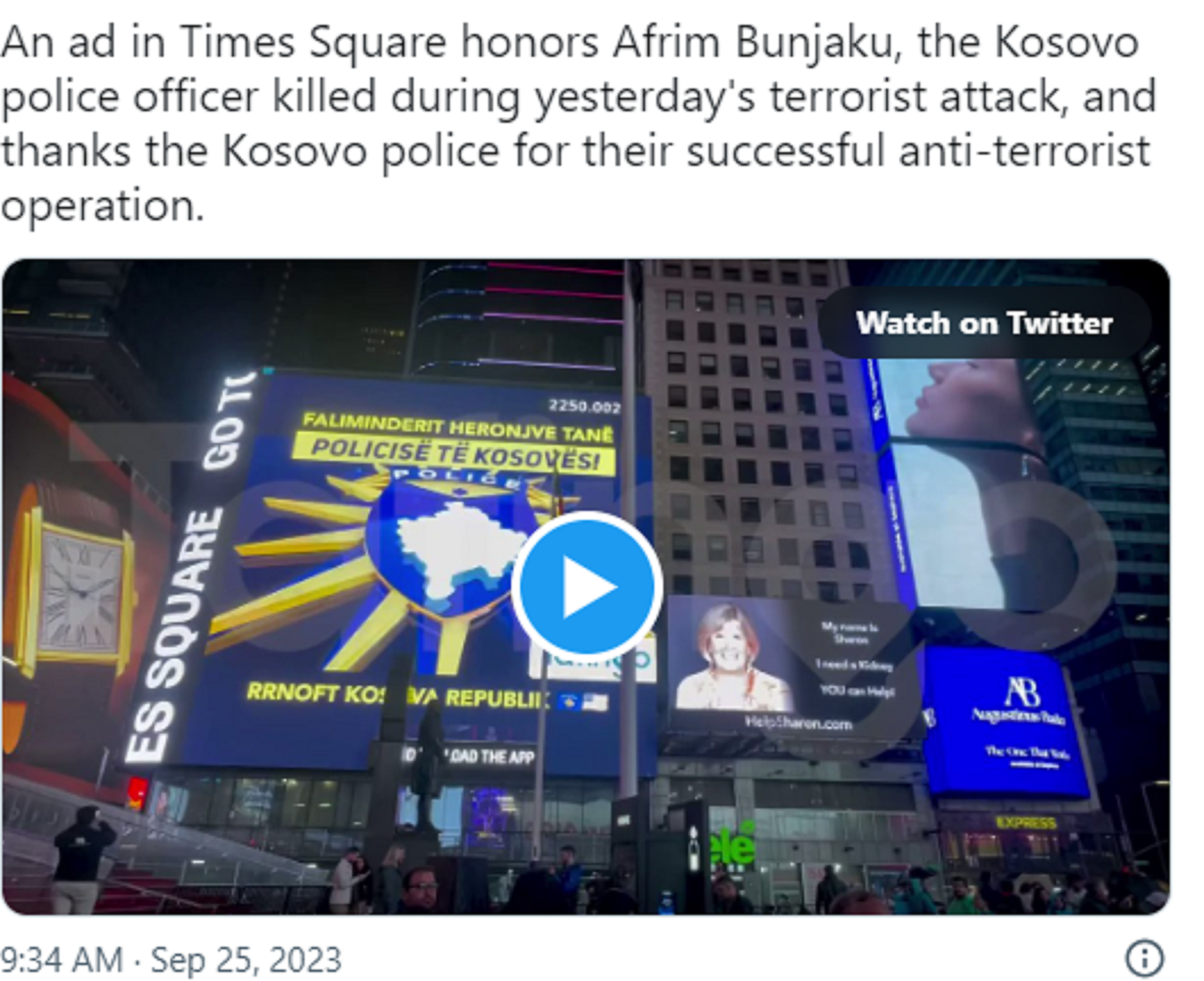 An ad in Times Square honors Afrim Bunjaku, the Kosovo police officer killed during yesterday’s terrorist attack, and thanks the Kosovo police for their successful anti-terrorist operation. pic.twitter.com/bsjkvEe7ZZ