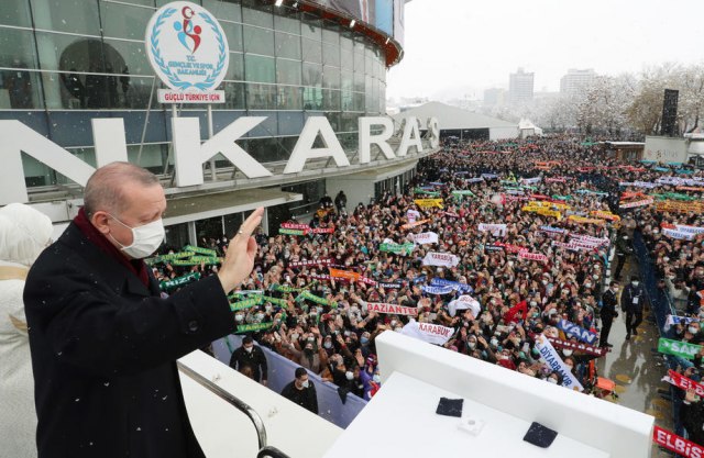 Покрај тоа што правилата за држење дистанца се уште се на сила и пред новиот налет на пандемијата од корона вирус во Tурција, илјадници приврзаници на владејачката партија ги пополнија трибините и седиштата во арената со 10.400 места во главниот град Анкара, пренесе Гардијан.