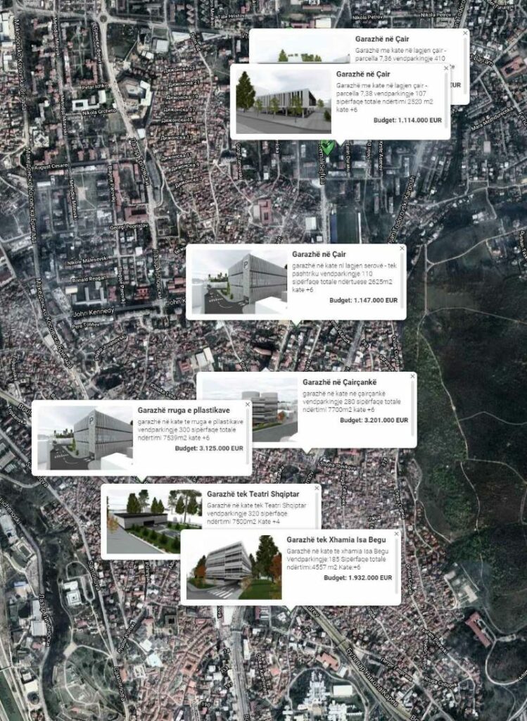 Кај џамијата Иса Бег ќе се гради катна гаража со 185 паркинг места во површина од 4.557 м2 и вредност од 1.932.000 евра, додека катната гаража кај Албанскиот театар ќе има 320 места за паркирање и ќе опфаќа површина од 7.500 м2 со вредност од 3.107.000 евра.