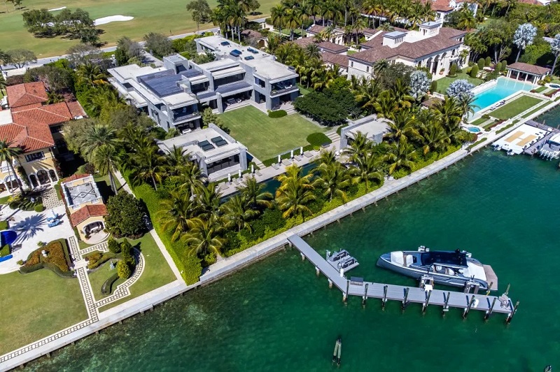Новите воздушни снимки добиени од „The Post“ покажуваат дека крајбрежниот комплекс на пензионираната икона на НФЛ на островот Индијан Крик, копнена маса позната и како „Бункер на милијардери“, е завршен. Сликите покажуваат модерна фасада со остри линии обвиткана во блед камен и стакло со поглед на заливот Бискејн и уредните зелени површини на кантри клубот Индијан Крик.