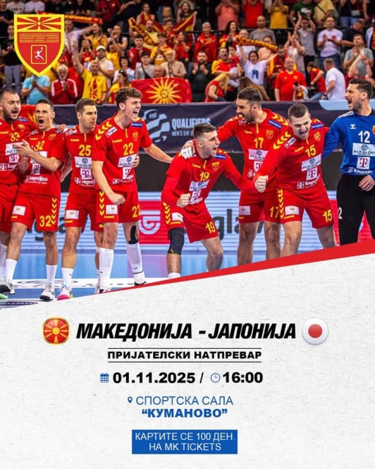 Влезниците за дуелот на ракометната репрезентација против Јапонија во Куманово се продаваат за 100 денари