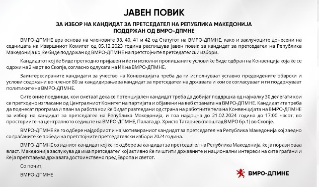 ВМРО-ДПМНЕ врз основа на членовите 38, 40, 41 и 42 од Статутот на ВМРО-ДПМНЕ, како и заклучоците донесени на седницата на Извршниот Комитет од 05.12.2023 година распишува јавен повик за кандидат за претседател на Република Македонија кој ќе биде поддржан од