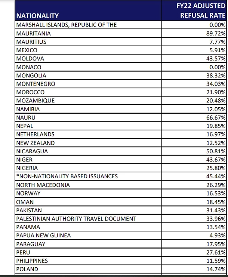 Од барањата за виза за САД биле одбиени и 3,66 отсто од Аргентина, Австрија– 6,97 отсто, Барбадос 6,55 отсто, Брунеи 5,41 отсто, Швајцарија 3, 05 отсто, Папуа Нова Гвинеја 4,93 отсто, Гватемала 5,45 отсто, Исланд 3, 24 отсто, Израел 2,27 отсто, Тајван 4,56 отсто.