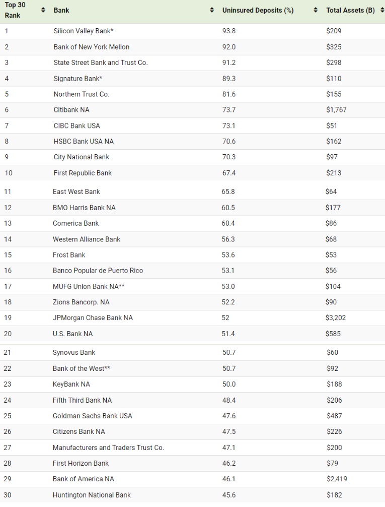 Во продолжение погледнете како се споредува нивното ниво на неосигурени депозити со другите банки. Податоците вклучуваат американски банки со средства од најмалку 50 милијарди долари на крајот на 2022 година.