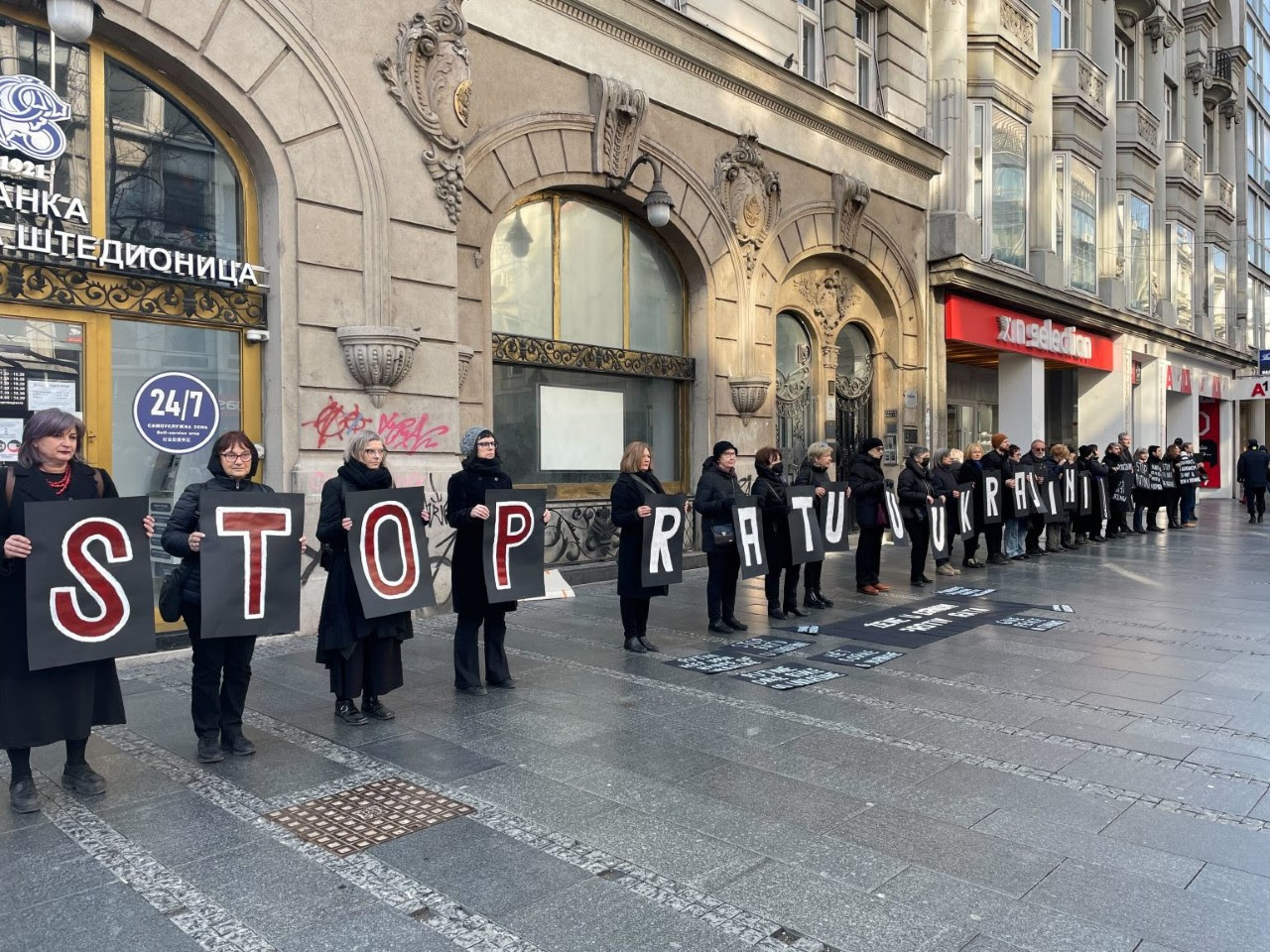 Жените во црно, околу 20-тина активисти носејќи голем транспарент на кој пишува „Стоп на војната во Украина“ на протестот ги посочија пораките против руската окупација и војната во Украина, повикувајќи на солидарност со украинскиот народ и бараат од Србија јасно да ја избере страната и да им се придружи на оние кои ја трпат руската инвазија.