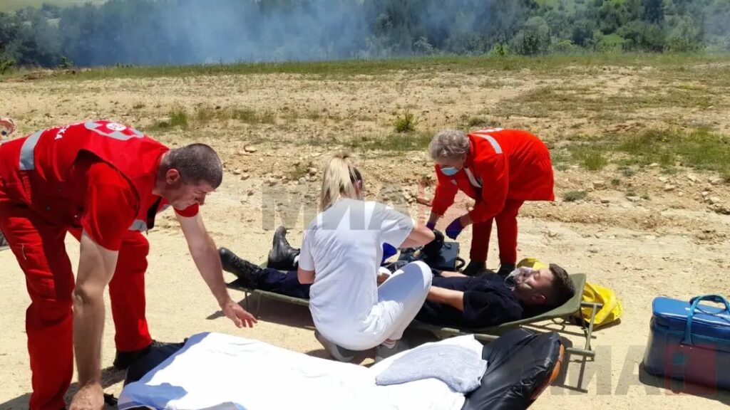 -Денеска во траење од неколку часови имавме билатерална вежба односно гасење на пожари на отворено. Учествуваа тимови од Бугарија, наши тимови, доброволните друштва. ПЕ на општините кои што гравитираат во регионот, заедно со тимовите оз воздухопловот, еден од воздухопловите на ДЗС и сите други пропратни единци, камиони, механизации, учествуваа во гасење на пожари на отворено, каде што се вклучени и други работни точки односно точки за пребарување на лица коишто се оддалечуваат и исчезнуваат во случај на избувнување на пожарот на куќа итн. Значи сценариото е да вежбата трае неколку часа на четири работни точки, а моментално се наоѓаме на претпоследната работна точка каде што дејствуваат доброволните друштва од регионот во гасење на пожари на отворено, а истовремено додека ние зборуваме ќе се подготвува и интервенција на нашиот воздухоплов во гасење на пожари на отворено, рече Максути.