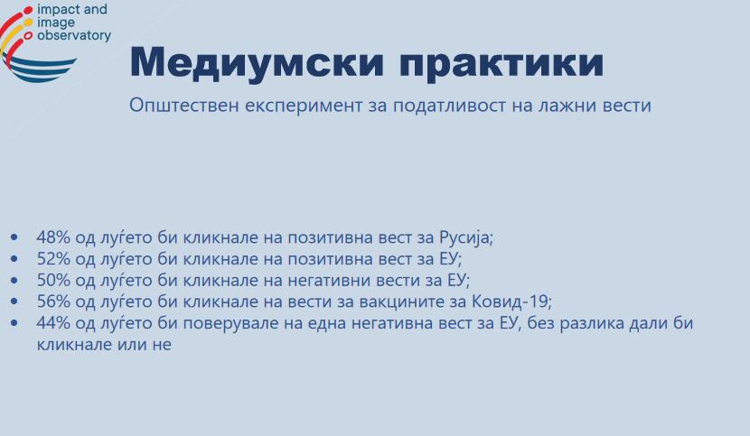 Партиски гледано, две третини и од тие што наклонуваат кон ВМРО-ДПМНЕ ја гледаат Србија како најголем пријател на Македонија, а само 45,5 отсто од СДСМ, додека петпати поголем процент од приврзаниците на СДСМ се за ЕУ, наспроти тие на главната опозициска партија. Практично, кај наклонетите на ВМРО-ДПМНЕ Русија се гледа како поголем пријател од ЕУ, иако за незначителен 0,1 процент.