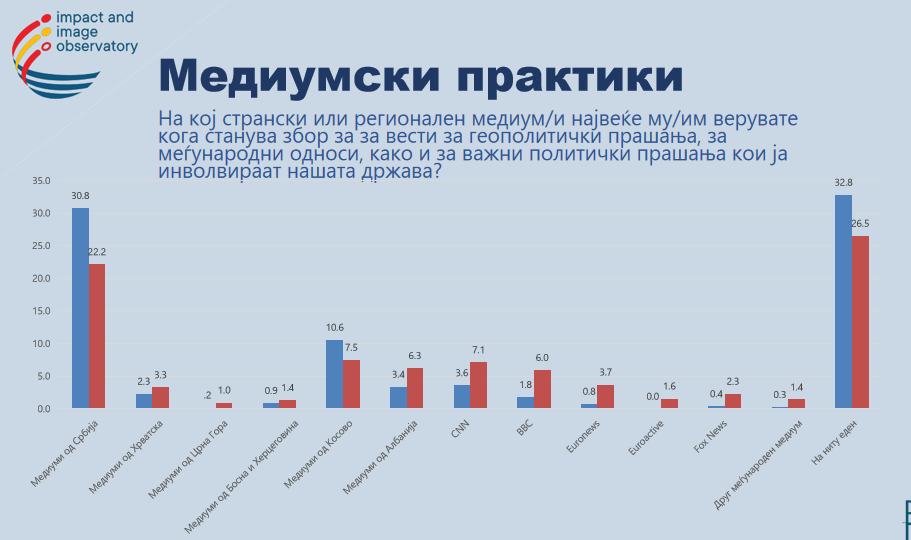 Истото прашање покажува дека и Србија ја губи довербата кај граѓаните во Македонија иако е на прво место, бидејќи и таа паднала од 90,8 отсто поддршка во 2022 година на 67,6 отсто на крајот на оваа година, а сличен тренд има и кај Албанија и Косово, што сугерира дека Македонците се разочарани од соседството. Гледано од аспект на етничката припадност, сликата е поинаква, па така наспроти Македонците кои ја избираат најпрво Србија, Албанците повеќе се свртени кон САД и ЕУ, па НАТО, Германија и на крајот – Албанија.