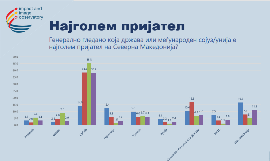 Без оглед на случувањата во Србија, граѓаните во нашата држава и натаму ја гледаат оваа држава како најголем пријател на Македонија. На анкетата спроведена од Институтот „Преспа“ од 23 ноември до 11 декември годинава, дури 38,2 отсто од граѓаните ја посочиле Србија како најголем пријател, пред ЕУ која има само 11,1 отсто и САД со 7, 7 отсто, додека за Русија се определиле само 2 отсто од испитаните.