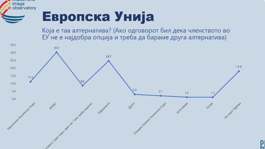 За друга алтернатива се изјасниле сепак 24, 1 отсто од граѓаните што пак натаму резултира со куриозитетни наоди. Најмногу граѓани алтернативната иднина ја гледаат во БРИКС (30,3 отсто), па во Неврзаните, Евро-азиската унија , во иницијативата на Кина „Еден појас, еден пат“, во Отворен Балкан, во Југославија, а најмалку во Русија (1,1 отсто).