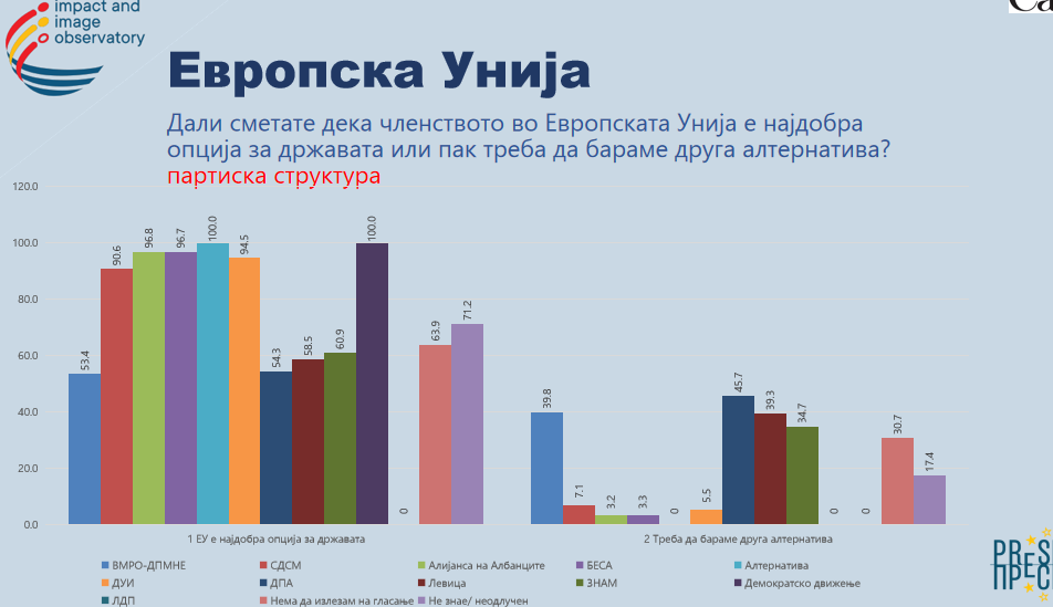 Притоа, дури 90,6 отсто од приврзаниците на СДСМ се изјасниле така, а 53, 4 отсто од ВМРО-ДПМНЕ, при што најсилна поддршка за ЕУ има кај албанските опозициски партии, а кај Демократското движење и Алтернатива таа е дури 100 отсто! Куриозитет е исто така дека 58,5 отсто од наклонетите кон Левица се за ЕУ, иако оваа партија важи како антизападна и анти-НАТО.