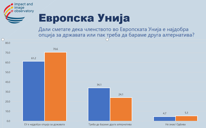 Наспроти ваквиот став, има значајно зголемување на процентот на граѓаните што сметаат дека ЕУ е најдобрата алтернатива за државата – односно од 61,2 отсто во мај годинава на 70,6 отсто сега.