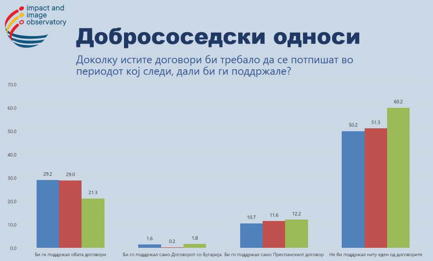 На главното прашање во моментов, дали би гласале за уставните измени за внесување на Бугарите и другите заедници во него, 23,2 отсто рекле „да“ за сите заедници, 39 отсто „да“, но не за сите, а дури 6 отсто повеќе во споредба со мај годинава рекле дека се против да се внесат во него Бугарите, што сугерира дека расте отпорот за изгласување на промените. Од анкетата се гледа дека Преспанскиот договор е поприфатлив од билатералниот договор со Бугарија, но генерално расте процентот на граѓани кои не ги поддржуваат ниту едниот ниту другиот.