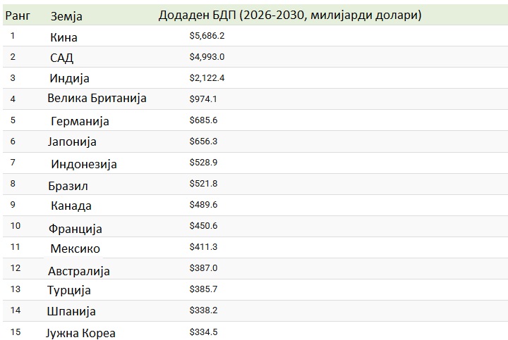Кина е на прво место по раст на вкупниот БДП, со очекуван раст од 5,7 билиони долари помеѓу 2026 и 2030 година. Веднаш зад неа се Соединетите Американски Држави, со зголемување од околу 5,0 билиони долари. Иако овие економии растат побавно во процент во споредба со многу пазари во развој, нивната големина значи дека дури и умерениот раст носи огромни добивки во долари.