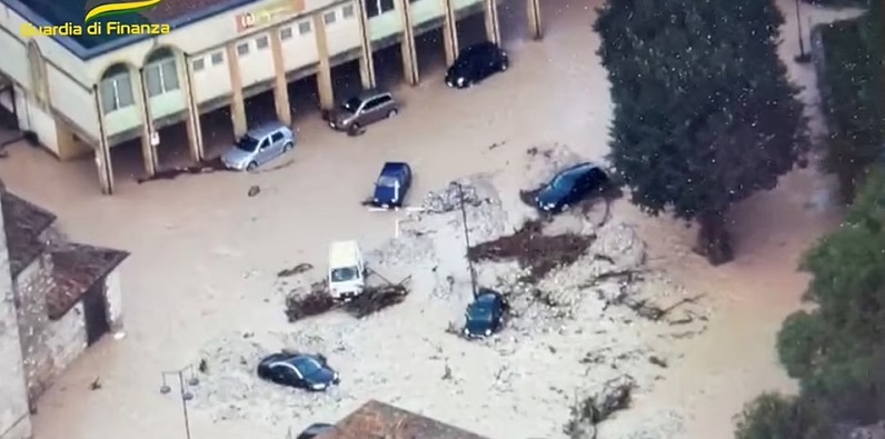 Хеликоптер за итни случаи снимал потопени автомобили и поплавени улици над Кантијано во регионот Марше.