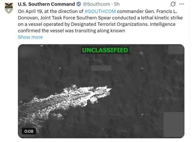 Јужната команда на војската на САД наведе дека цел биле наводни трговци со дрога долж познатите рути за шверцување. Кампањата на напади врз бродови во латиноамериканските води под обвинение за наркотероризам трае од минатиот септември.