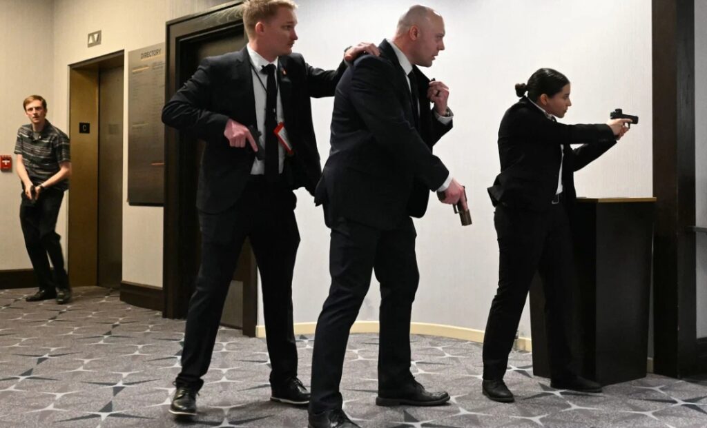 „Тргнете се од патот, господине!“ извика некој. Други извикаа да се наведнат. Од еден агол, започна скандирање „Бог да ја благослови Америка“ додека претседателот беше придружуван да се тргне надвор од сцената. Тој падна накратко – очигледно се сопнал – и му помогнаа агенти на Тајната служба. Надвор од хотелот, членови на Националната гарда и други власти го преплавија просторот додека хеликоптери кружеа над него.