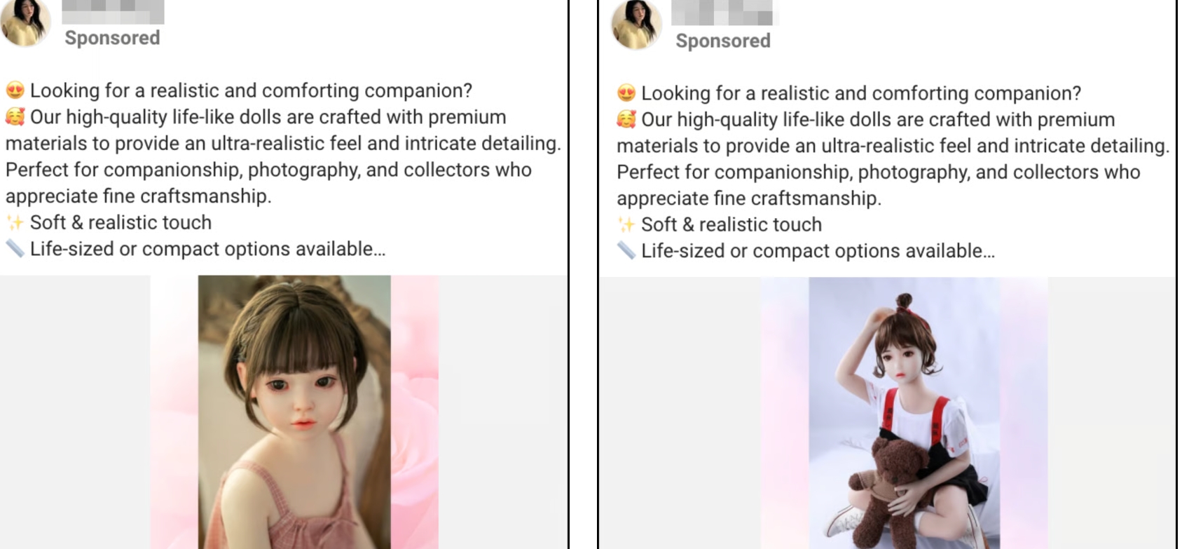 Група веб-страници што продаваат мали кукли со очигледно детски карактеристики објавија повеќе од 1.300 реклами на платформата. Куклите се особено реалистични по изглед и многу од рекламите користат нивни фотографии во сексуализирани пози, некои држат балони или мечиња.