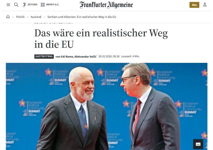 Во заеднички авторски текст за „Франкфуртер алгемајне цајтунг“, албанскиот премиер Еди Рама и српскиот претседател Александар Вучиќ нагласуваат дека не инсистираат на членство во Европската Унија, туку на прием на нивните земји во единствениот европски пазар и Шенген зоната.