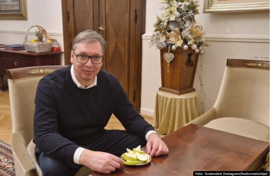Претседателот на Србија, Александар Вучиќ, на социјалните мрежи сподели фотографија како јаде јаболка непосредно пред акцијата за разбивање на протестот во Белград.