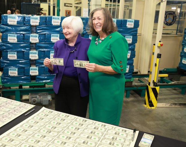 Американскиот секретар за финансии Џенет Јелен и федералниот благајник Лин Малерба отпатуваа во фабриката за печатење на долар во Форт Ворт, Тексас, каде што ги потпишаа новите банкноти од долар и од пет долари што треба да бидат издадени следната година.