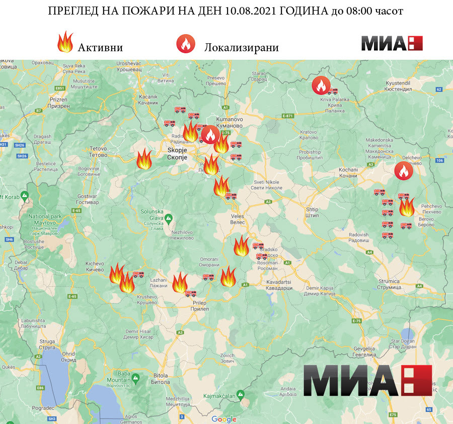 Пожарот во пехчевско-беровскиот регион е ставен под контрола, а се уште гори во Чучер Сандево во Скопје, поточно во селото Побожје, каде што се запалени три куќи. Уште гори и во кумановскиот и прилепскиот регион. Во меѓувреме, локализиран е пожарот во селото Разловци во делчевскиот регион, но и оној кај селото Герман во Крива Паланка.
