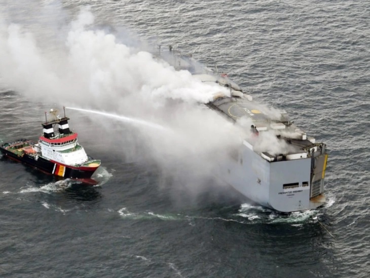 Започна извлекувањето на запалениот брод со автомобили на холандскиот брег